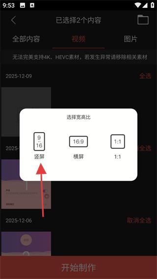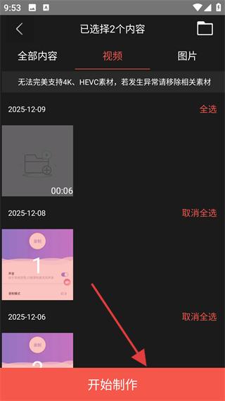 2、在素材页勾选目标视频片段后,点击【开始制作】。