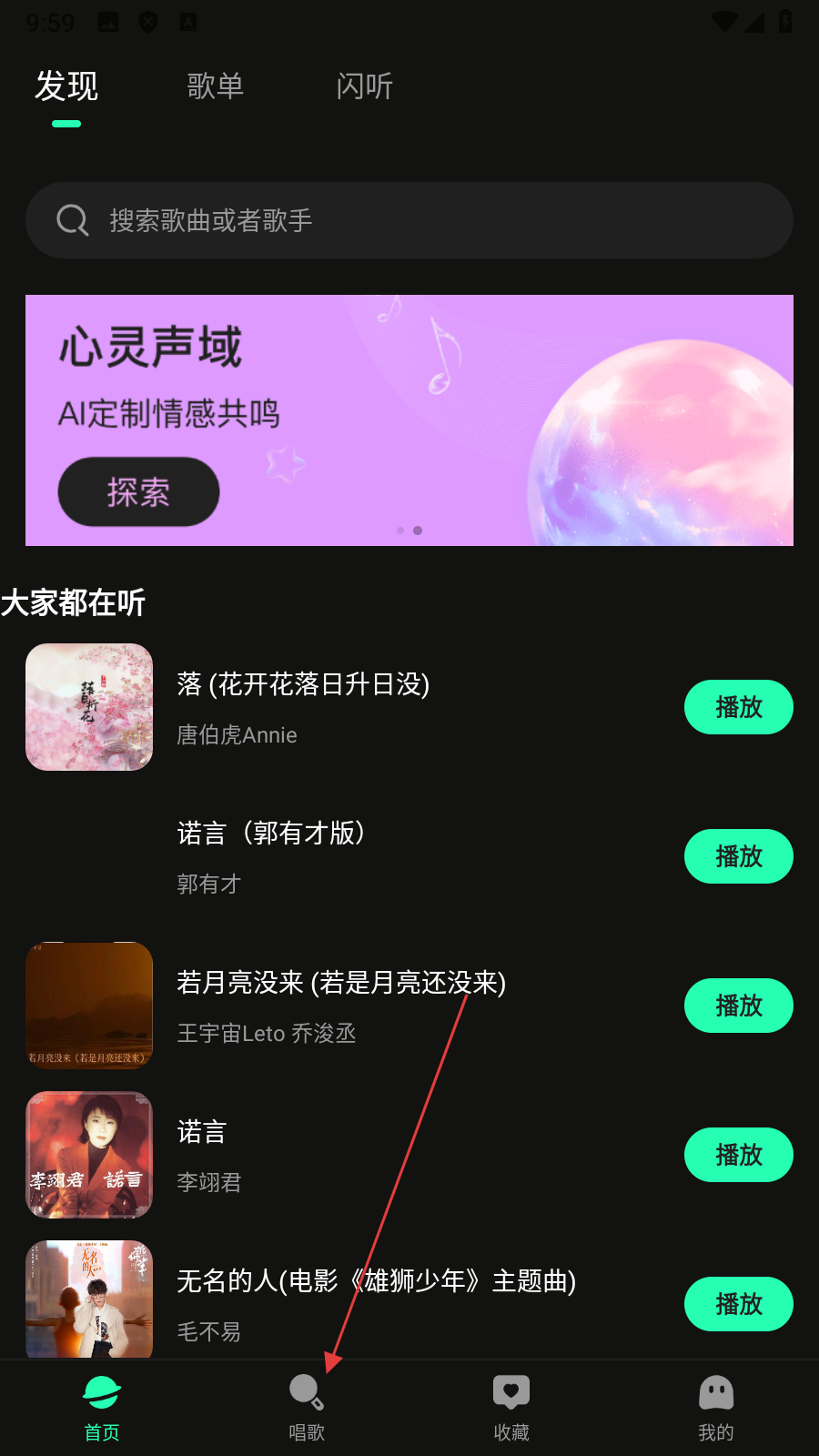 1、在首页,点击底部【唱歌】,进入唱歌功能页面。