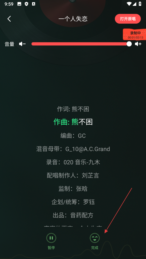 4、演唱结束后,点击【完成】,即可结束歌曲的演唱录制操作。