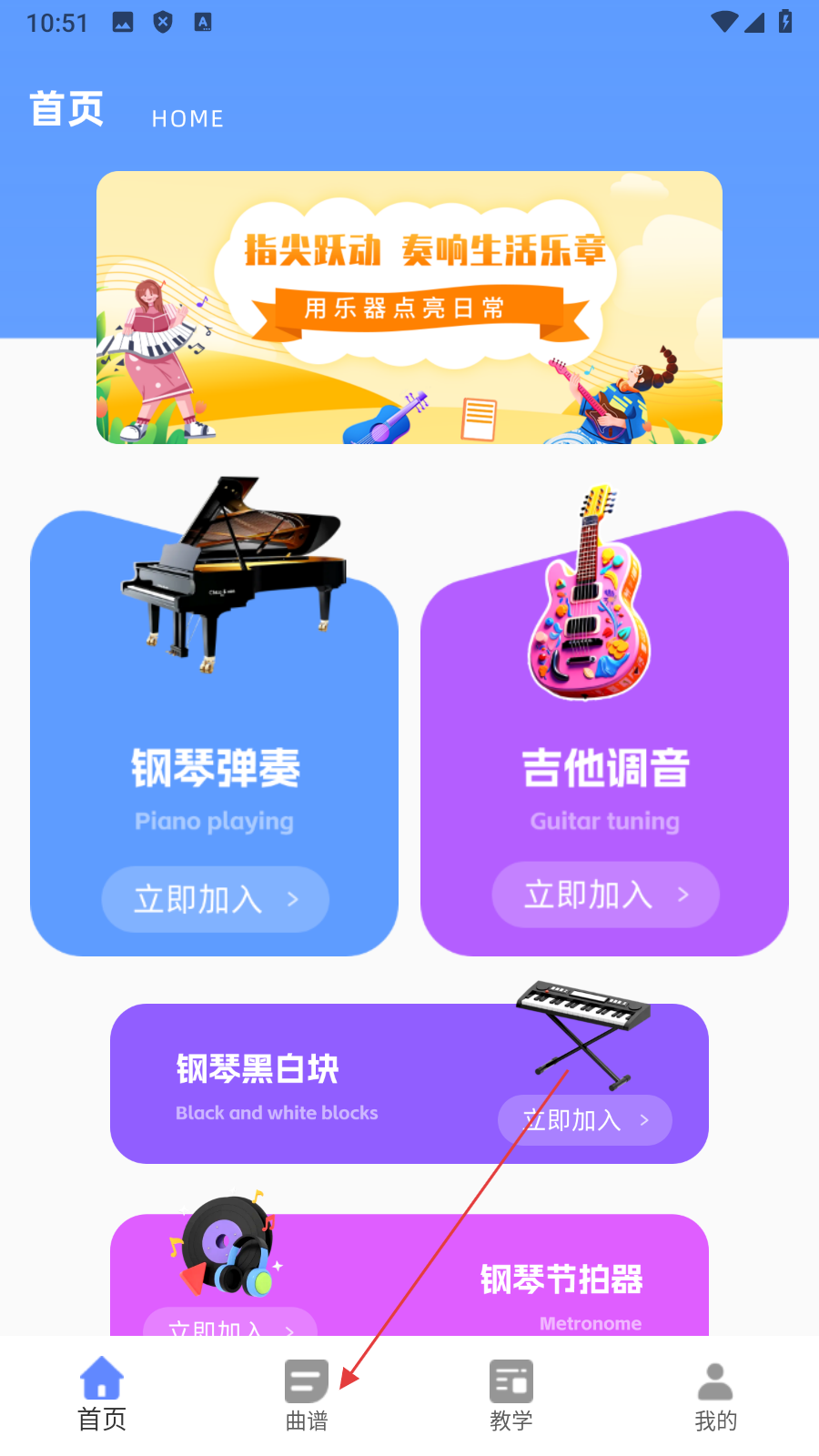 1、在首页,点击底部【曲谱】,进入曲谱功能页面。