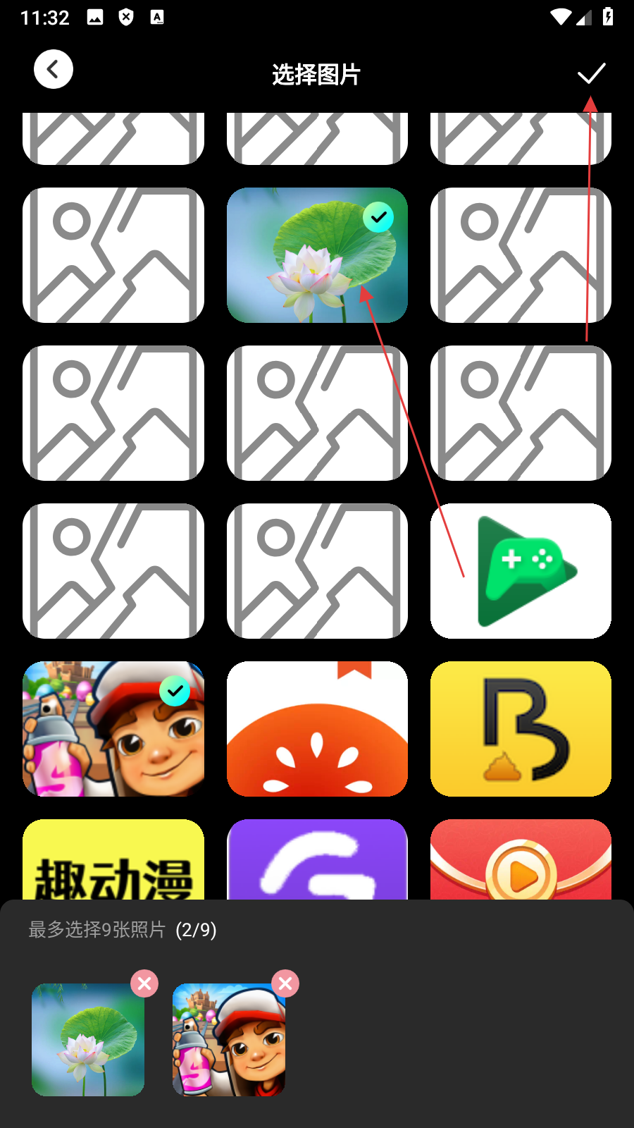 2、在选择图片界面,勾选【两张图片】后,点击【右上角对勾】,进入拼图编辑界面。