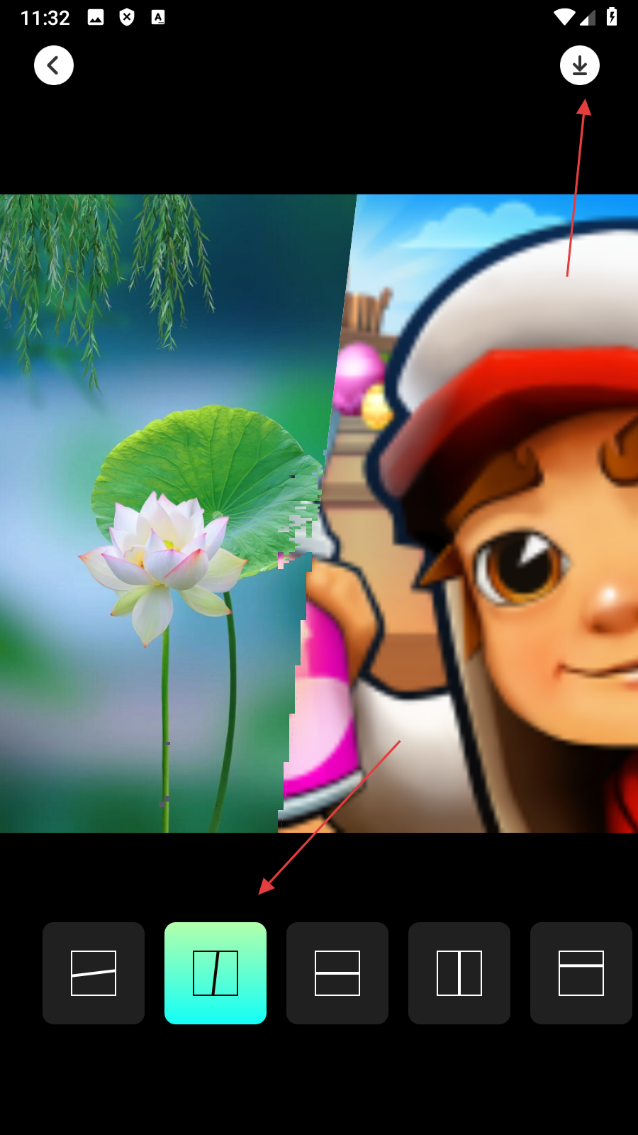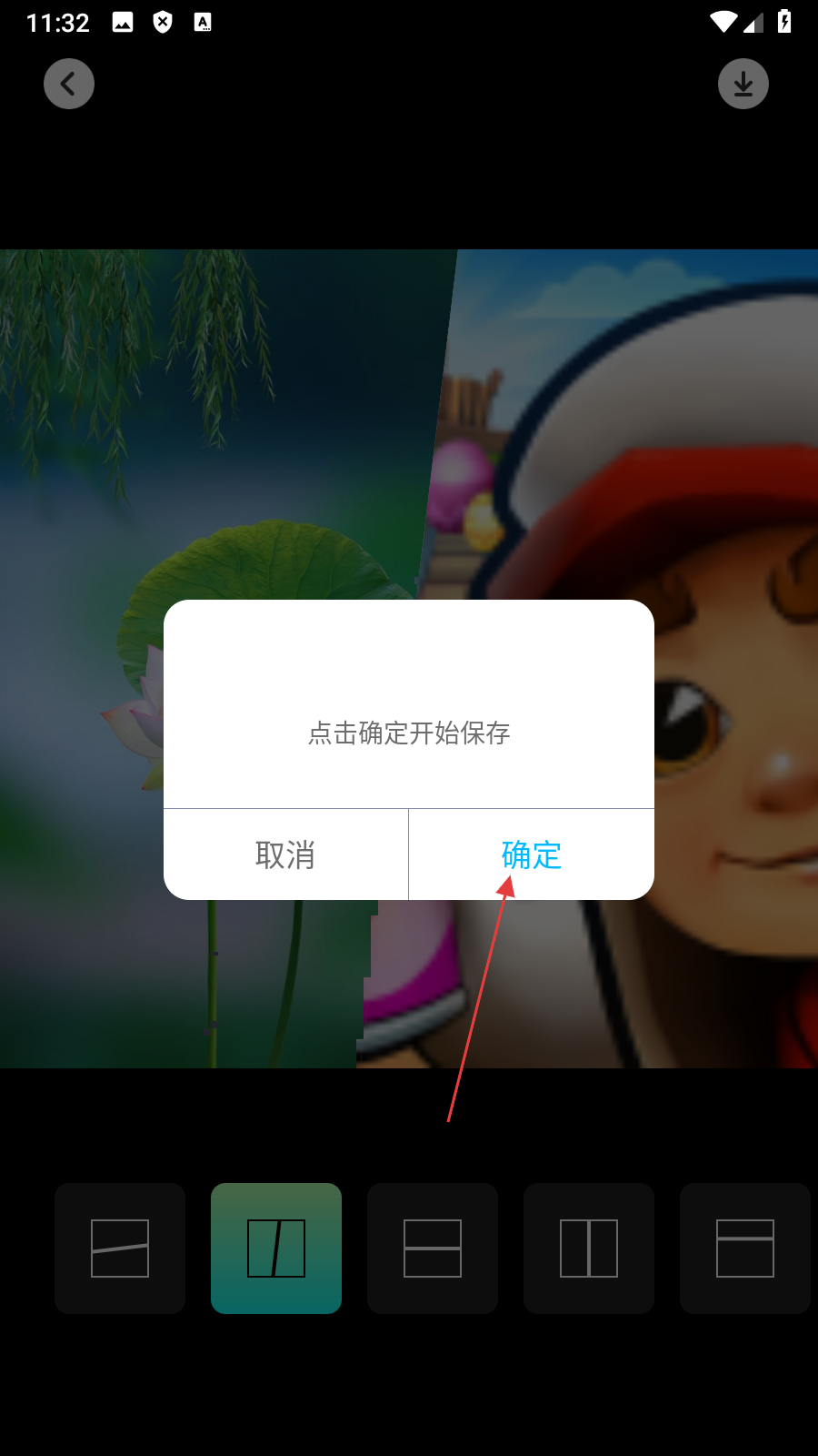 3、在拼图编辑界面,选择【喜欢的拼图样式】后,点击【右上角下载图标】,弹出保存提示框。