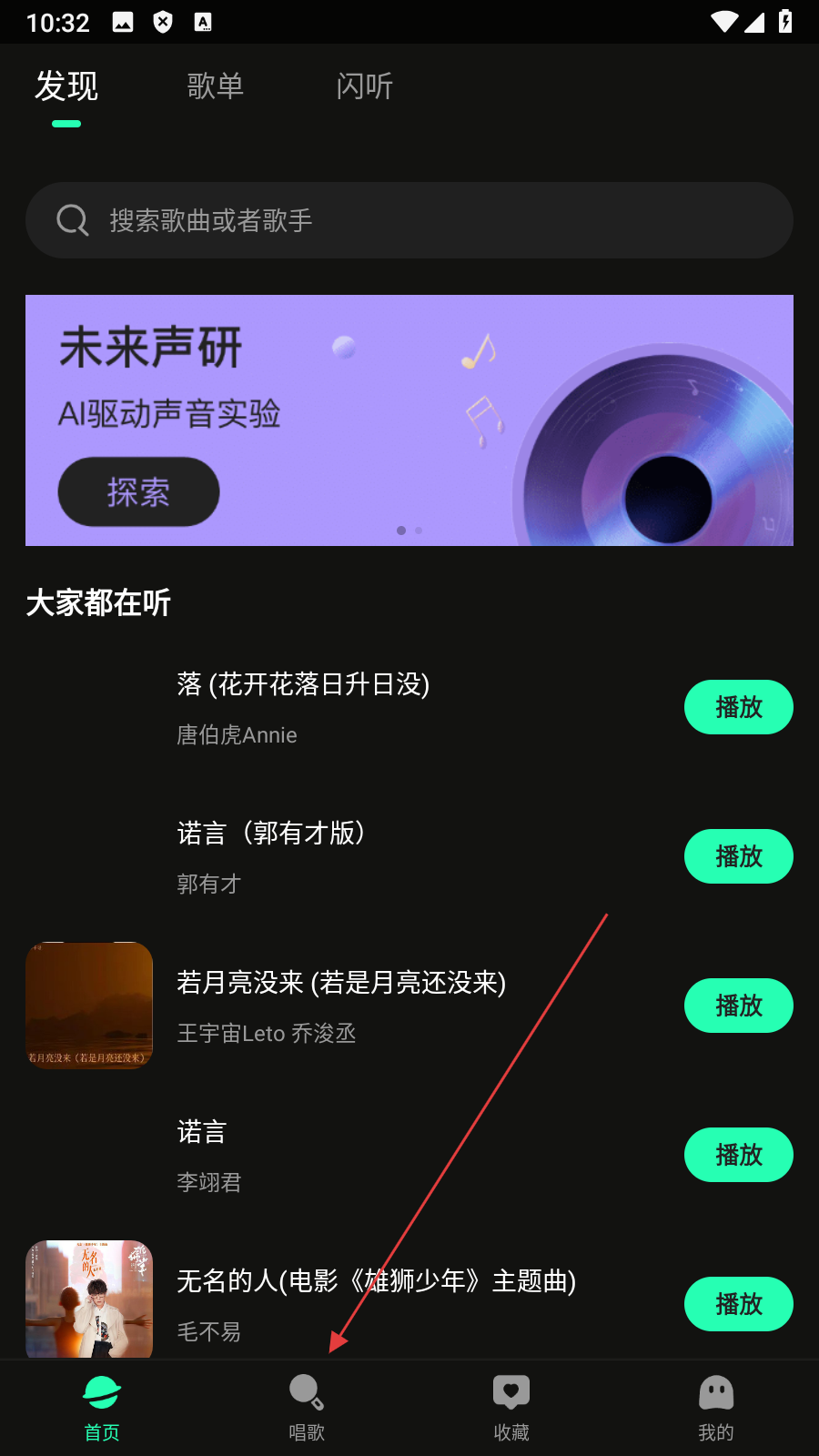 1、在首页,点击底部【唱歌】,进入唱歌页面。