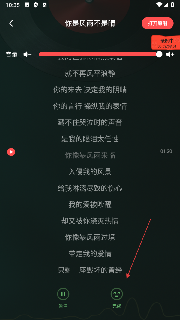 4、在录制界面,完成演唱后点击【完成】,即可结束歌曲录制操作。