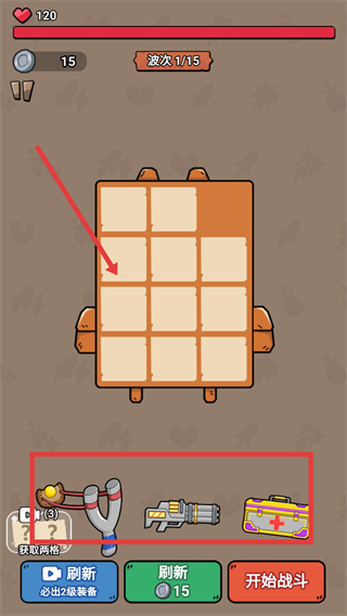2、在战斗准备界面,将下方红色框内的武器、道具(如弹弓、枪、医疗箱等)拖入上方网格中进行搭配,组建战斗组合。
