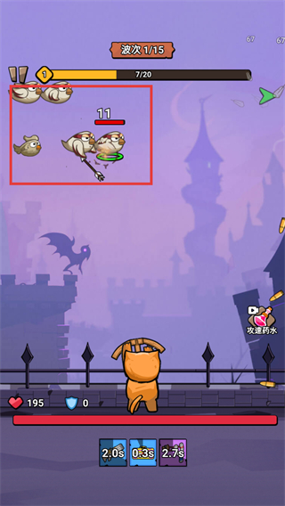 3、进入战斗后,瞄准红色框内的敌人进行攻击,消灭敌人,推进波次进度。
