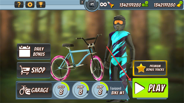 1、点击【PLAY】进入游戏场景,开启山地自行车竞速之旅。