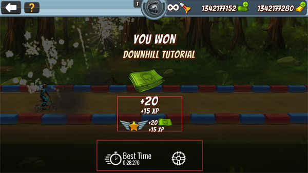 4、完成关卡后,获取奖励,查看最佳时间,用于后续自行车升级和解锁新赛道,提升竞速能力。