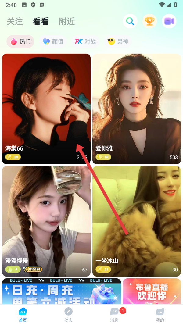 1、在首页,点击【心仪主播的直播间】,进入直播观看界面。