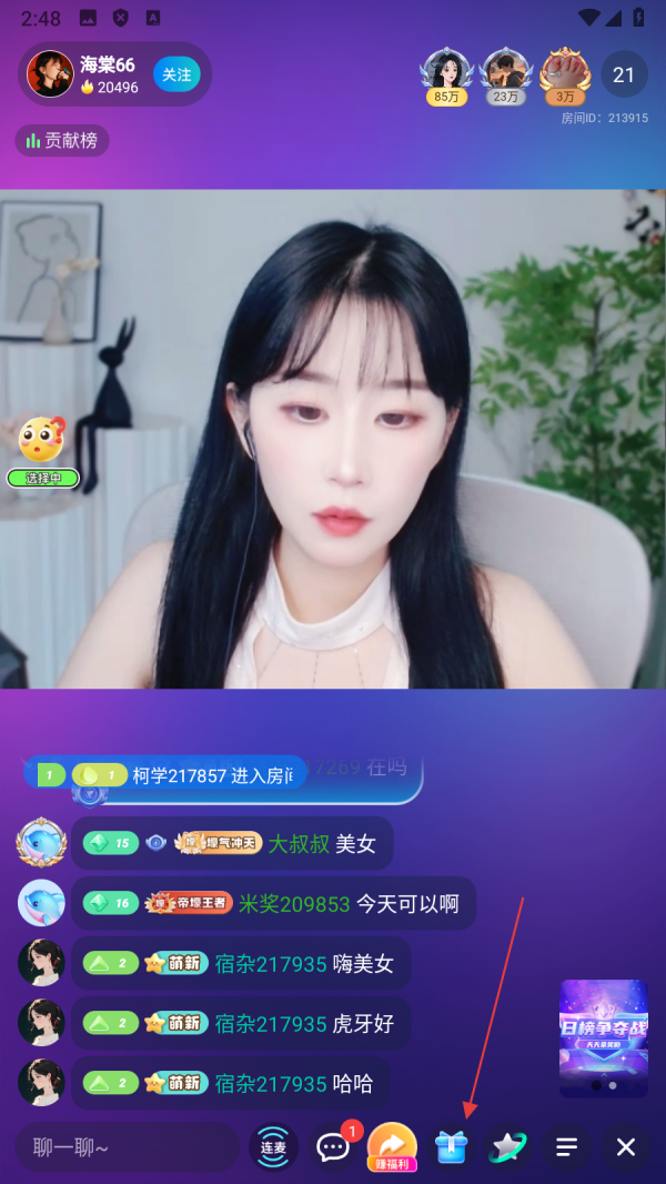 2、在直播观看界面,点击【礼物图标】,展开礼物列表。