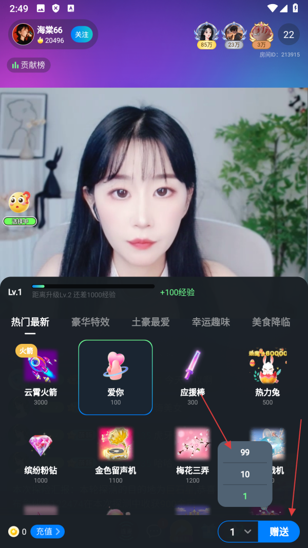 4、选择好礼物【赠送数量】后,点击【赠送】,即可完成给主播送礼物的操作。