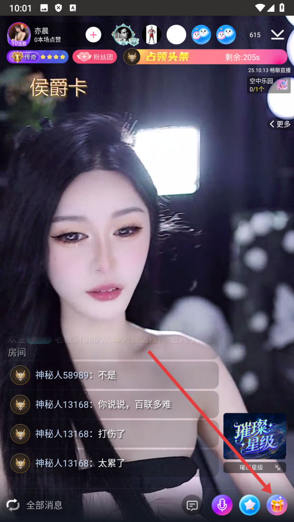2、在直播观看界面,点击【礼物图标】,展开礼物列表。
