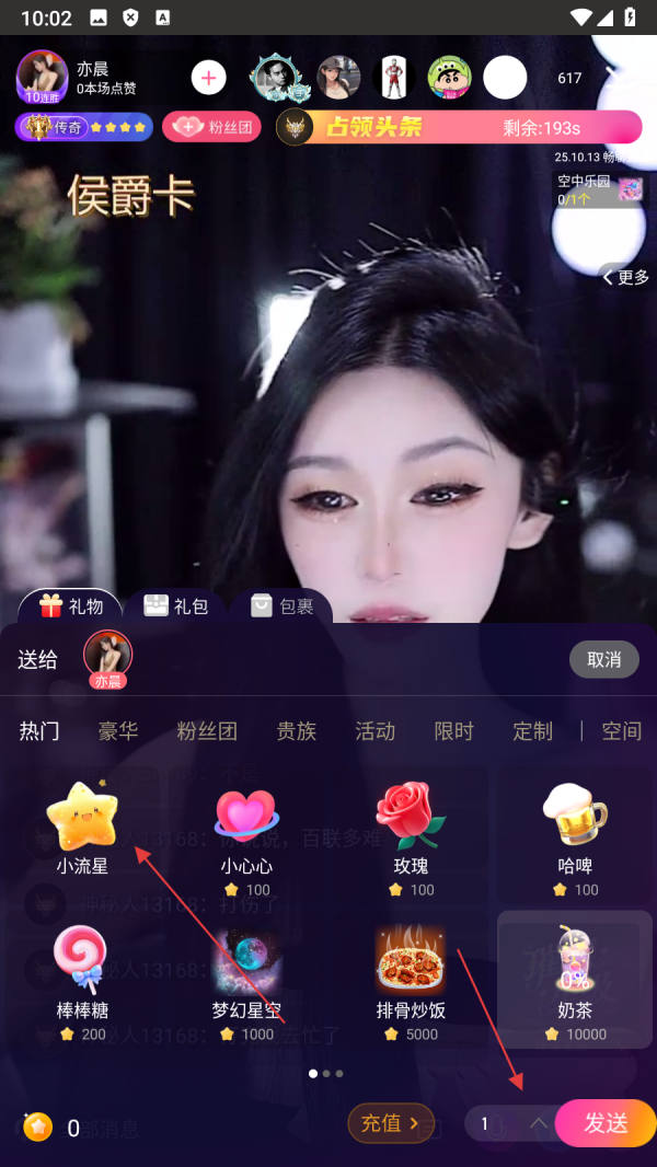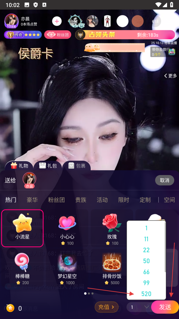 3、在礼物列表中,选择【想要赠送的礼物】,并点击【赠送数量】。