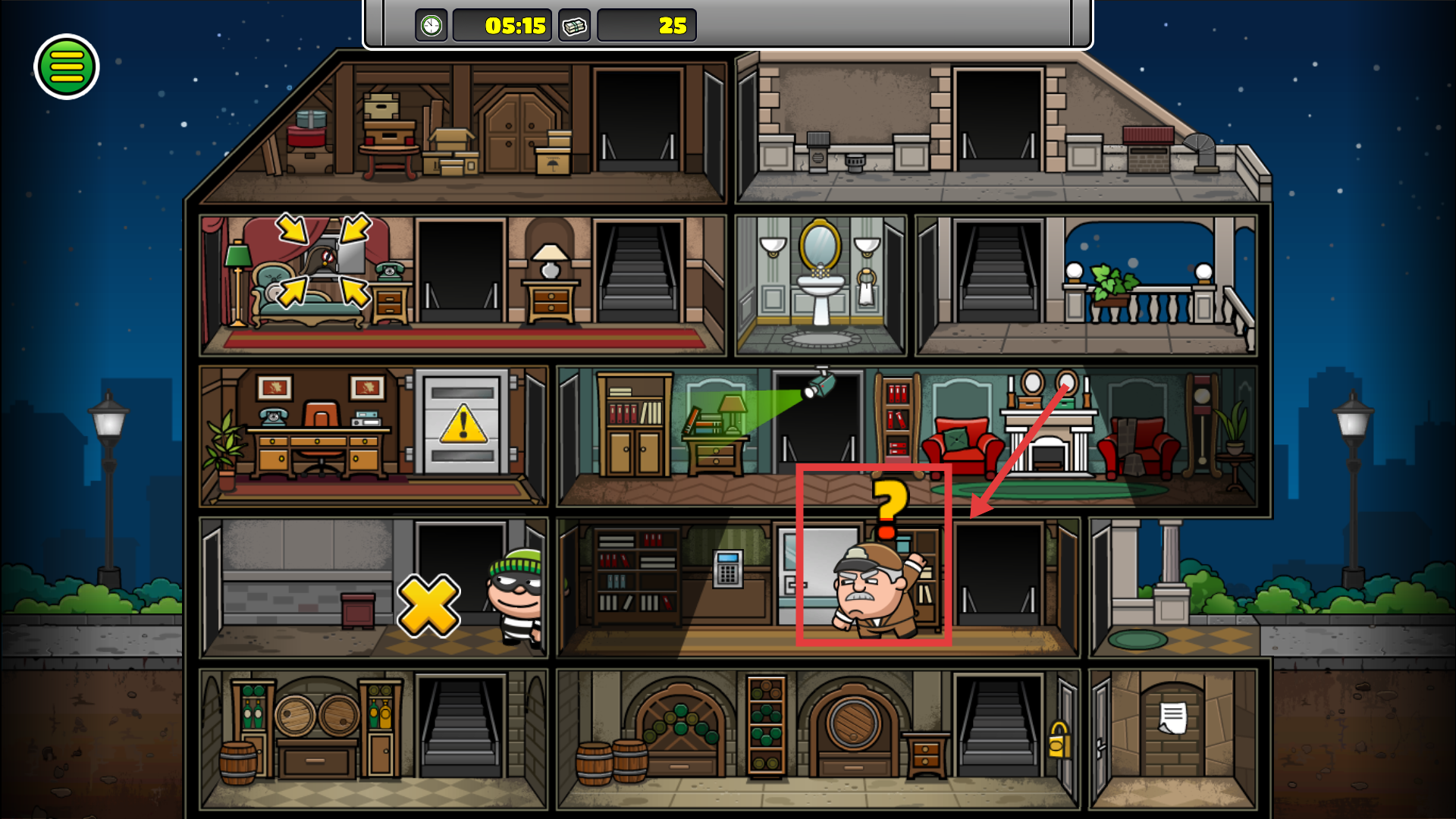 1、按照绿色箭头提示移动鲍勃,避开守卫视线,搜刮房间内的战利品,保持行动隐蔽不被发现。