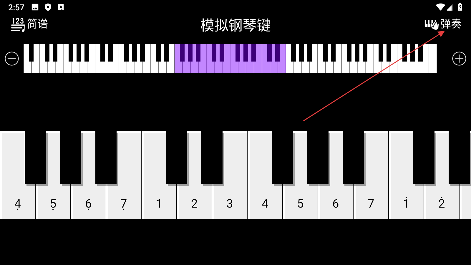 1、在模拟钢琴键页面,点击右上角【弹奏】,进入音乐列表页面。