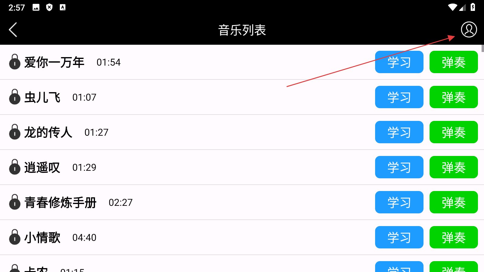 2、在音乐列表页面,点击【右上角头像】,进入我的页面。
