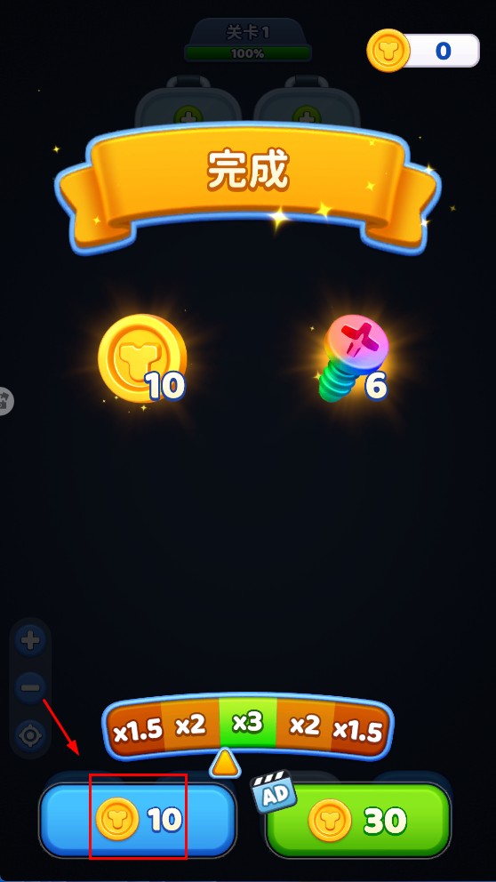 4、通关后点击蓝色按钮领取【10】金币奖励,无需广告即可获得奖励进入下一关。