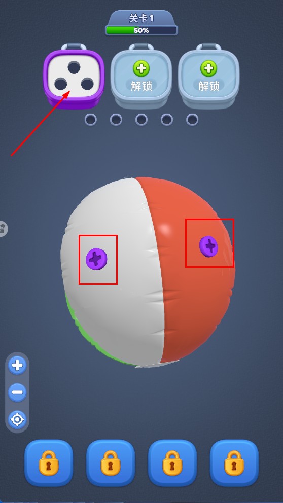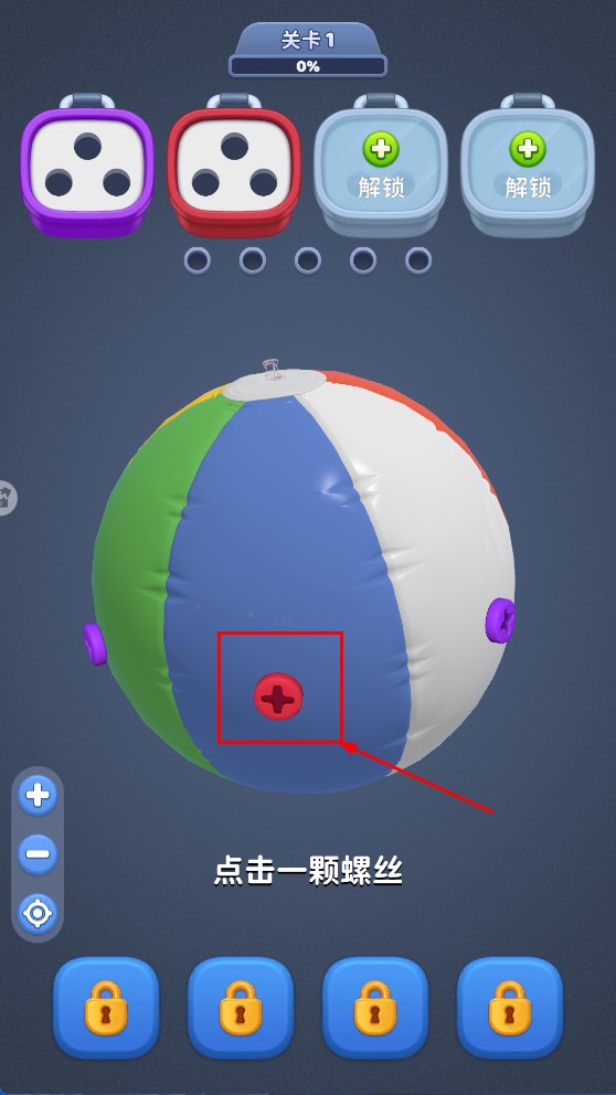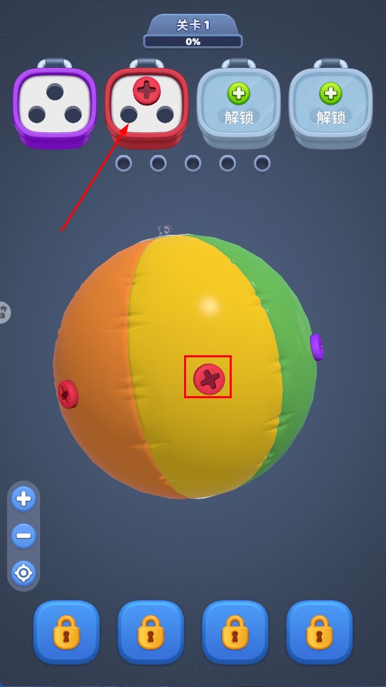 1、点击球上的红色螺丝,将其收集到上方红色盒子中,开始关卡的螺丝消除流程。