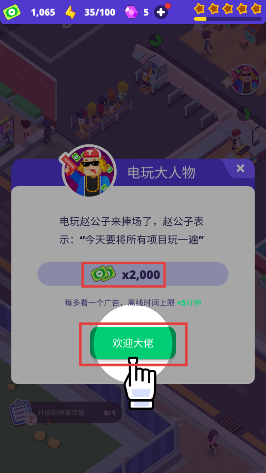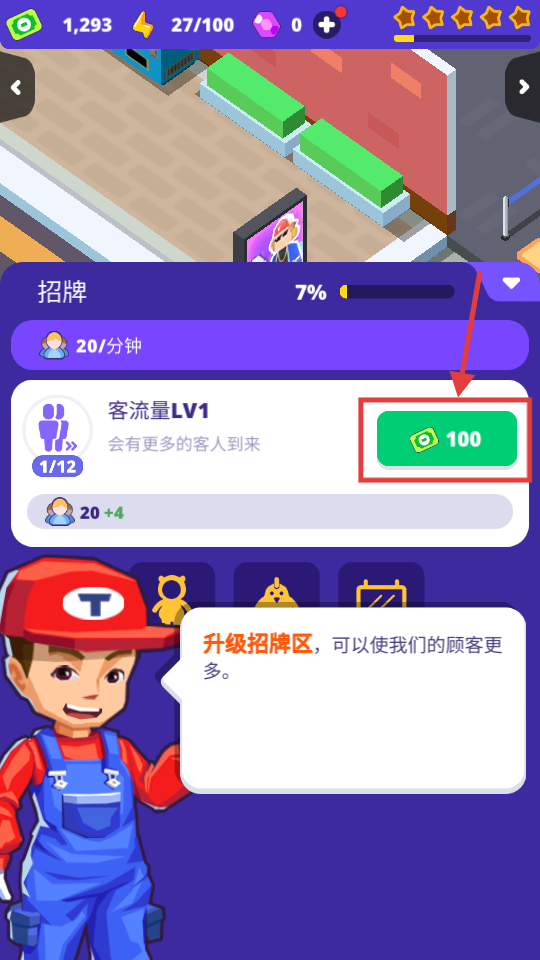 1、花费【100】货币升级招牌客流量,提升每分钟到客数,吸引更多顾客来电玩城消费。