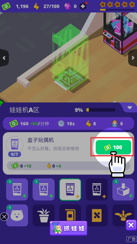 3、花费【100】货币升级【盒子玩偶机】,提升娃娃机A区收益,助力任务进度。