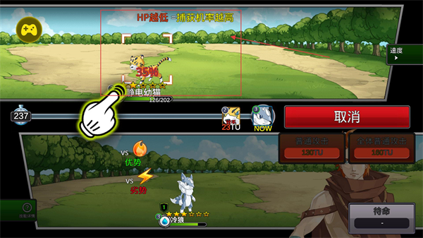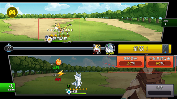 2、进入战斗后,目标怪兽会显示属性优势/劣势提示,消耗TU值使用普通攻击或全体攻击,同时可点击捕获尝试收服怪兽。