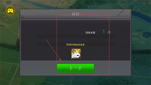 4、完成战斗或捕获后,会进入奖励界面,可获得训练点数与新怪兽,点击下一个继续推进流程,积累资源与伙伴以拓展队伍。