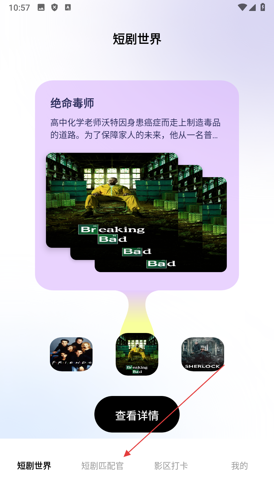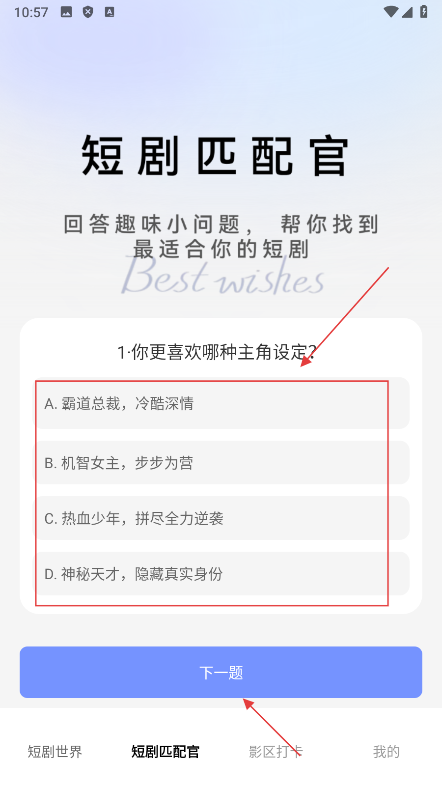1、点击底部【短剧匹配官】,进入短剧匹配答题页面。