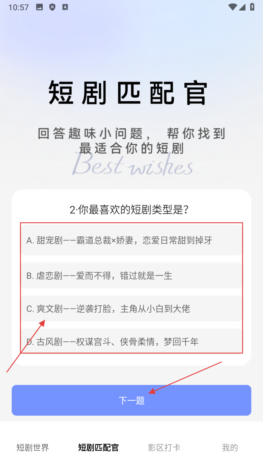 2、在短剧匹配官页面,【回答第一题】后点击【下一题】,继续答题。