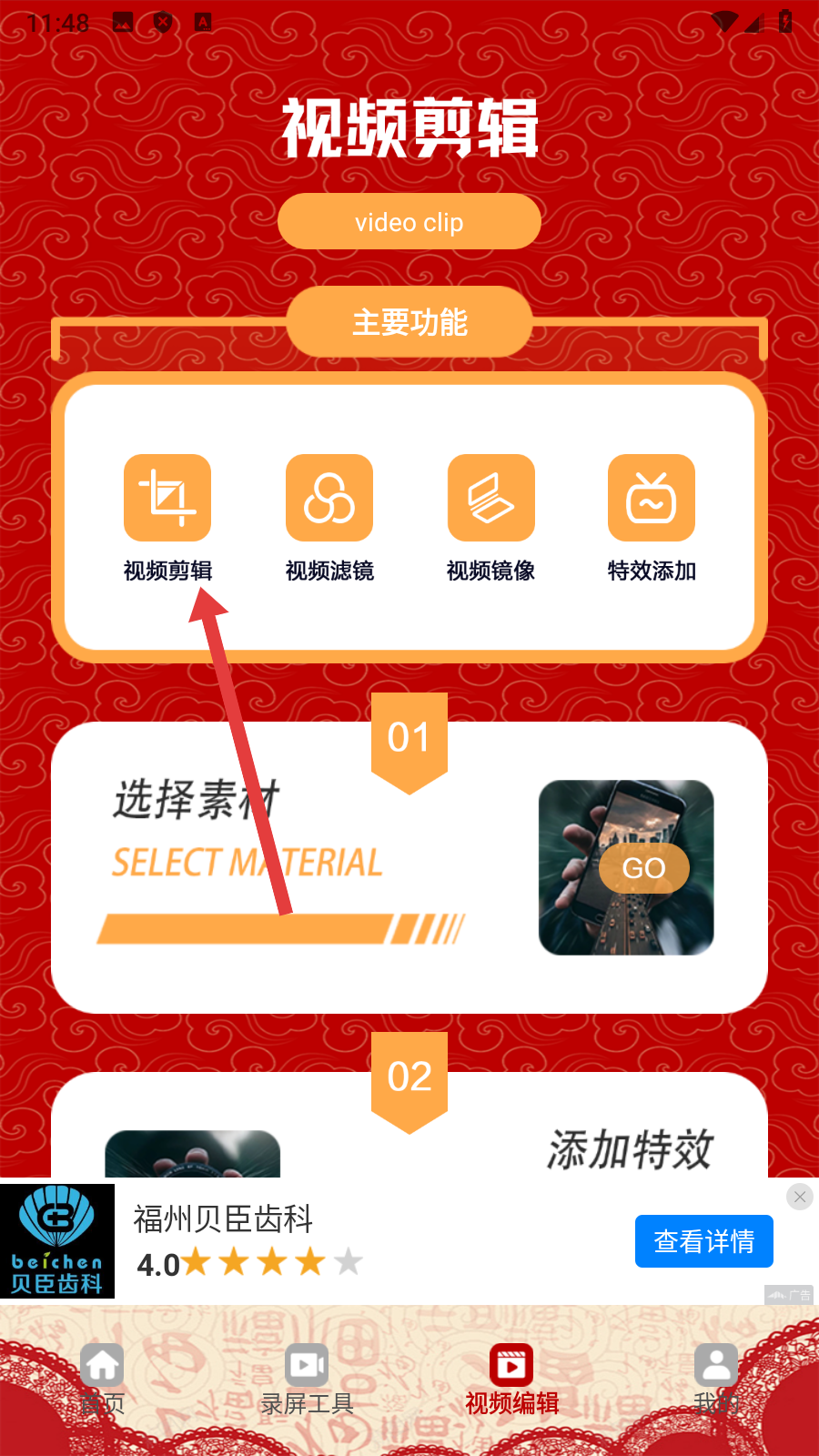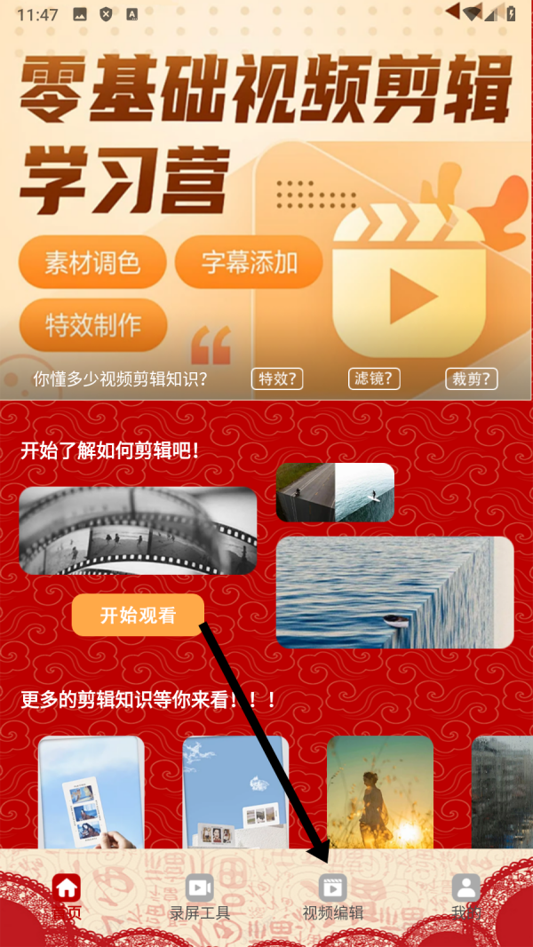 1、点击底部【视频编辑】,进入视频剪辑功能页面。