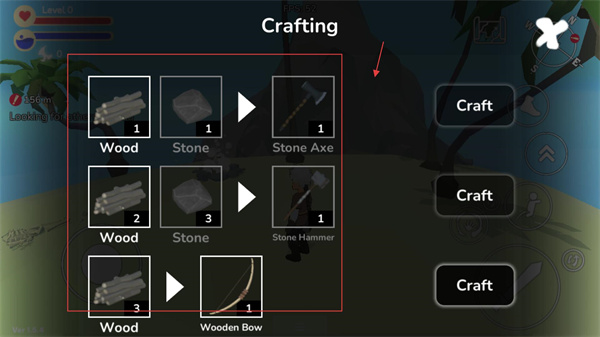 3、进入【Crafting】界面,消耗【Wood】和【Stone】可合成工具如【Stone-Axe】,点击【Craft】完成制作以提升生存能力。