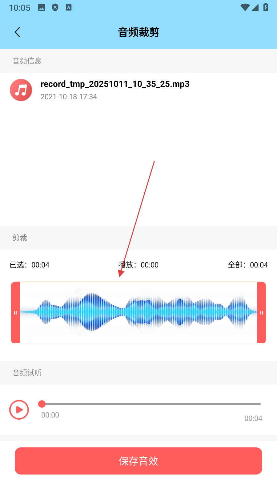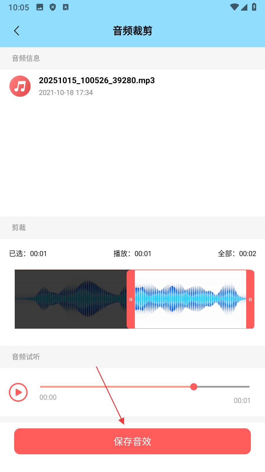 4、裁剪完成后点击【保存音效】,即可完成音频裁剪操作。