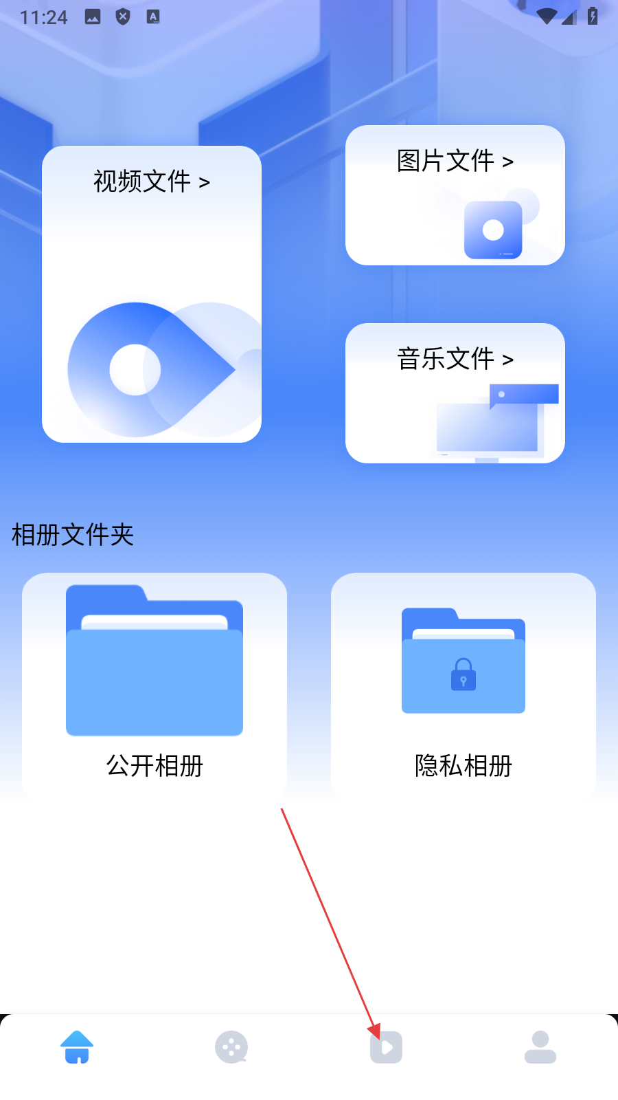1、点击【底部视频图标】,进入视频功能页面。