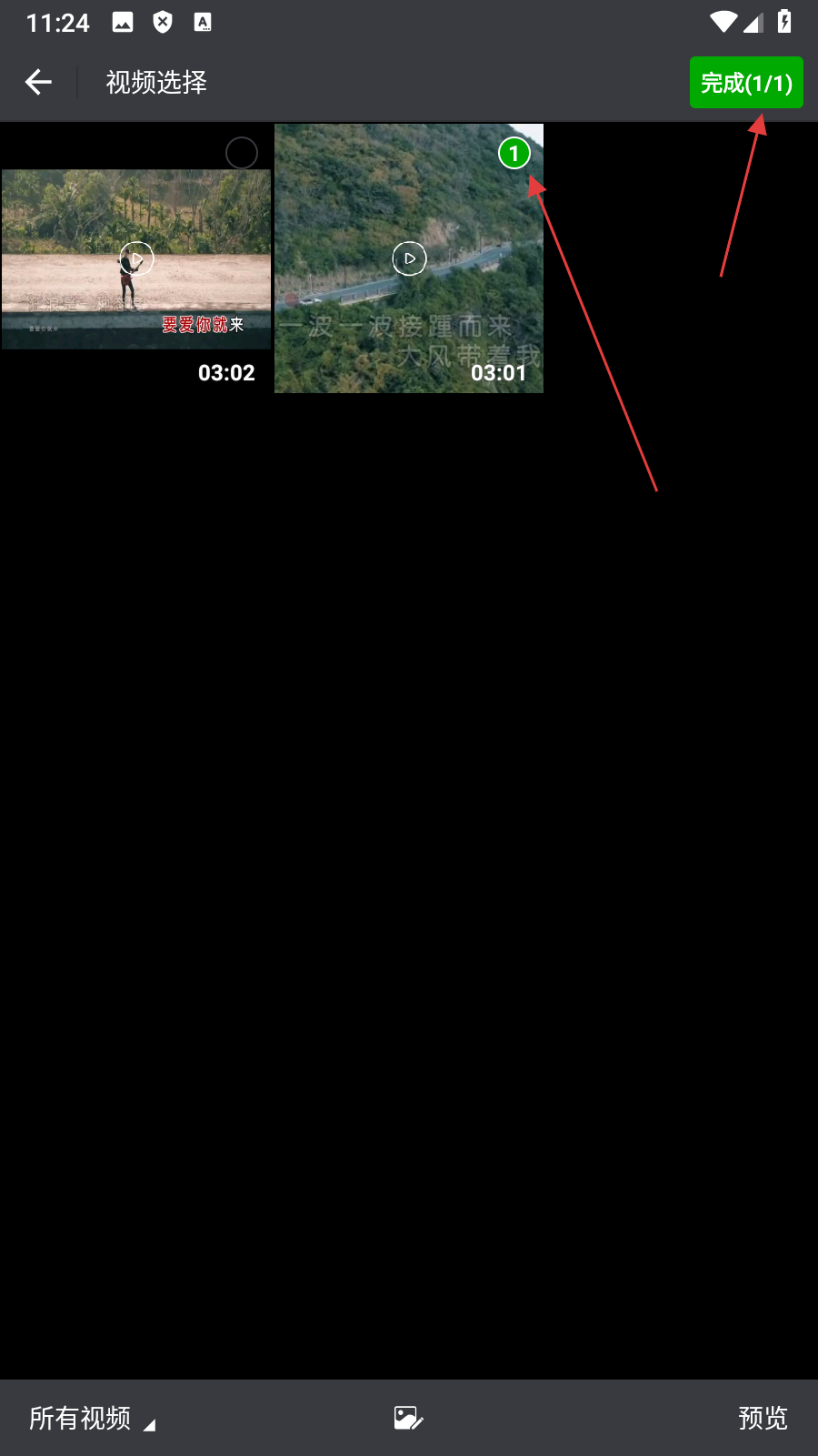 3、在视频选择页面,【选择视频】后点击【完成】,进入视频编辑页面。