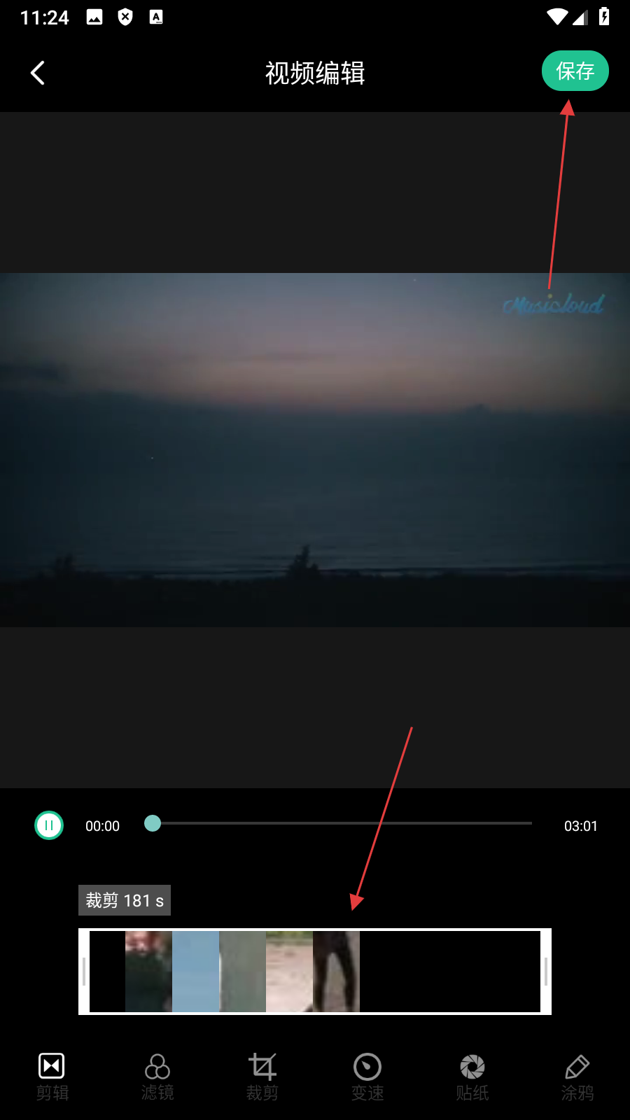 4、在视频编辑页面,【裁剪】后点击【保存】,即可完成视频裁剪操作。