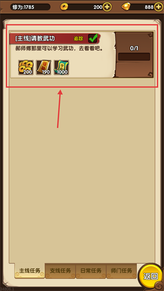 1、接受【主线-请教武功】任务,获取【200-金币】【190-经验】【1000-学点】,前往郝师傅处学习武功。
