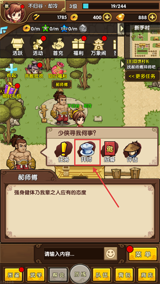 3、找到【郝师傅】,点击对话界面中的【拜师】选项,开启学习武功的流程,为后续提升能力做准备。