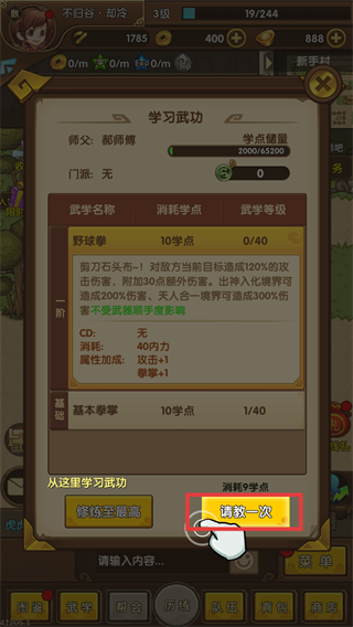 4、在【学习武功】界面,消耗【10-学点】点击【请教一次】,学习【野球拳】提升攻击和拳掌属性。