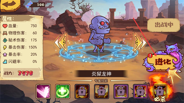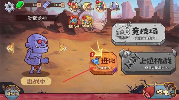 1、主界面点击【进化】按钮,可提升当前魔物【炎狱龙神】的战力。