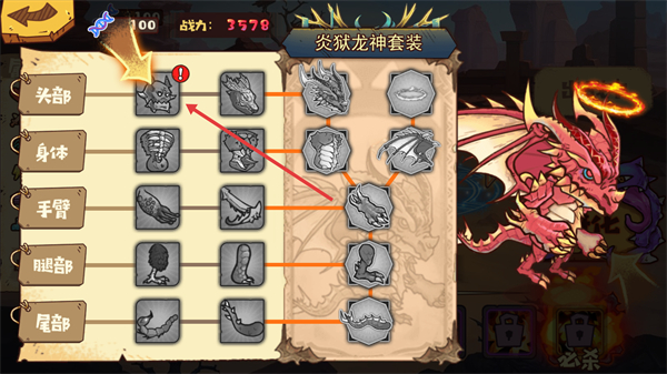 3、在进化界面选择对应部位的进阶部件,按【炎狱龙神套装】的图谱解锁更高级的身体部位,提升战力。