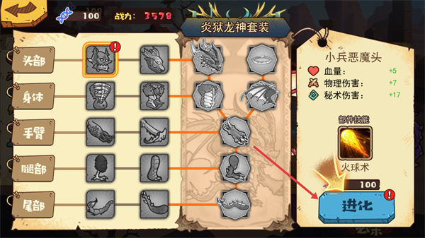 4、选择部件(如“小兵恶魔头”)后,花费对应资源点击【进化】,可获得属性加成(如血量+5)与新技能(火球术),增强魔物能力。