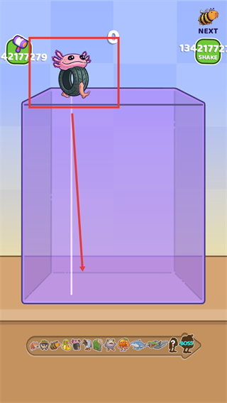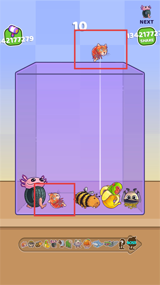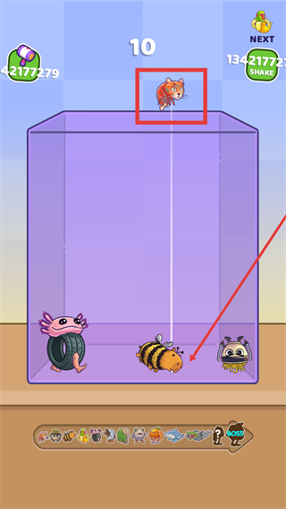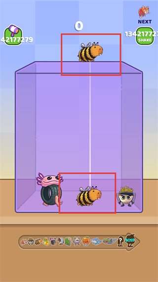 2、观察到容器内已有【蜜蜂水豚】,将顶部相同生物放入对应位置,可触发合并提升等级与分数。