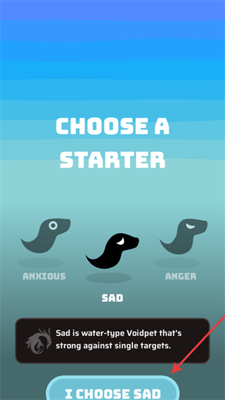 1、选择初始虚空宠物时优先选【SAD】,它是水属性对单体目标输出强,点击【ICHOOSESAD】按钮开启冒险。