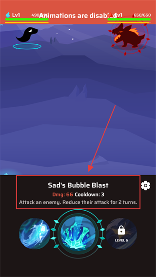 4、战斗中优先使用【Sad'sBubbleBlast】技能,它能攻击敌人并降低其攻击2回合,合理安排释放时机。