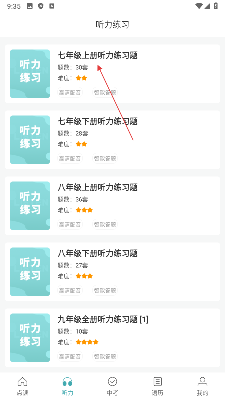 5、设置初中听力练习板块,内容由简到难逐步进阶,学生可根据自身水平选择练习,便于了解自身听力情况并针对性提升。