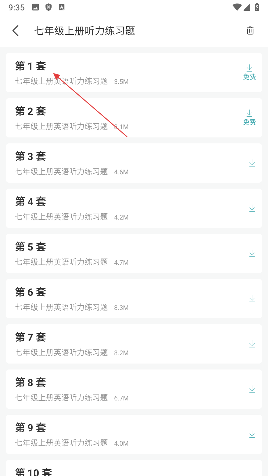 3、在听力套题页面点击【第1套】,进入听力习题页面。