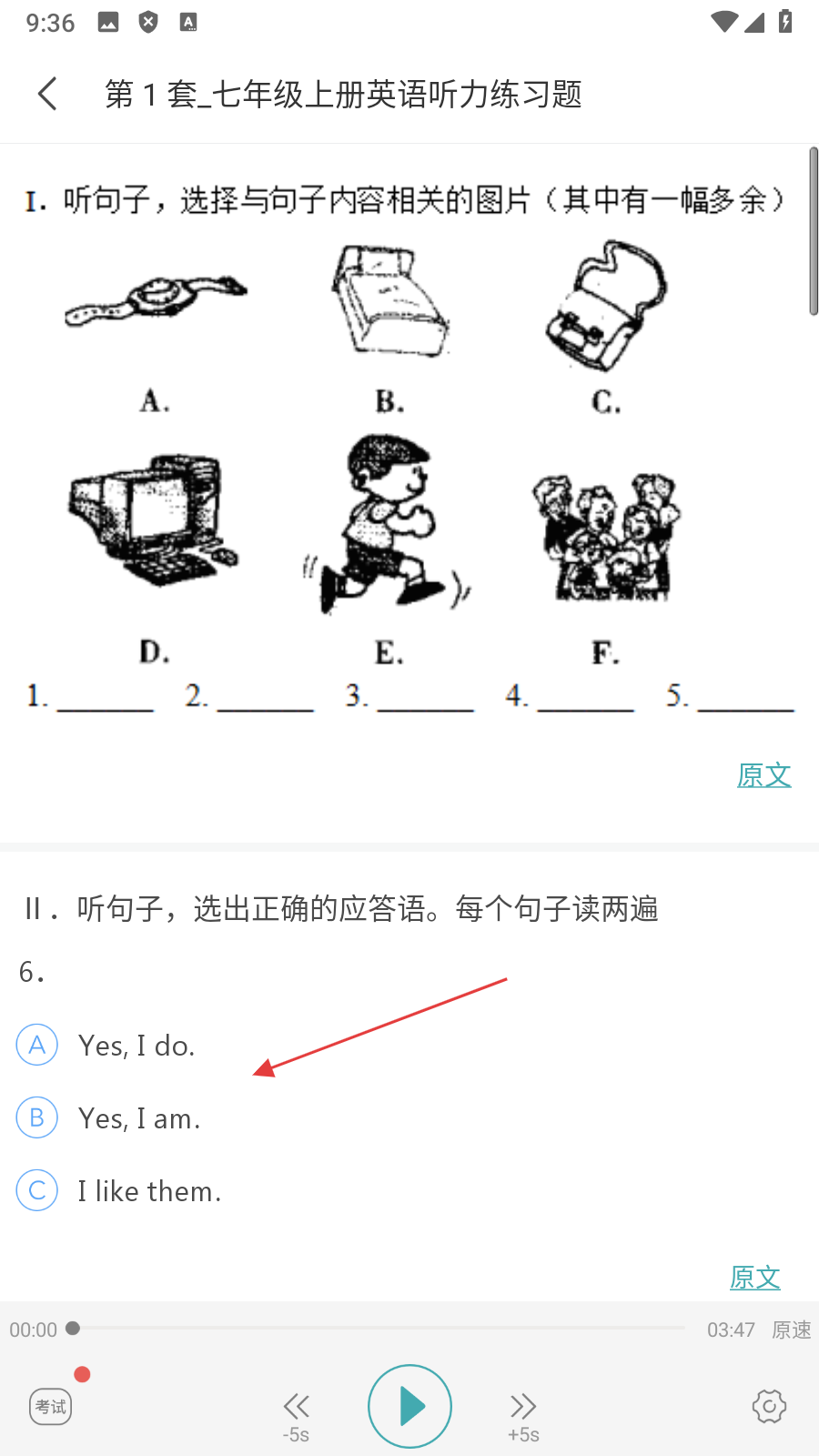 4、在听力习题页面可进行【听力答题操作】,即可提升英语听力能力。