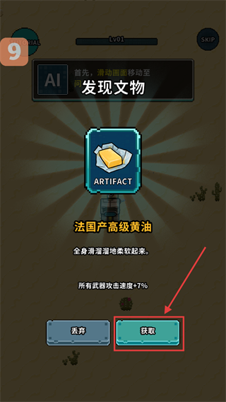 2、遇到文物时点击【获取】按钮,获取【法国产高级黄油】文物,提升所有武器7%攻击速度。