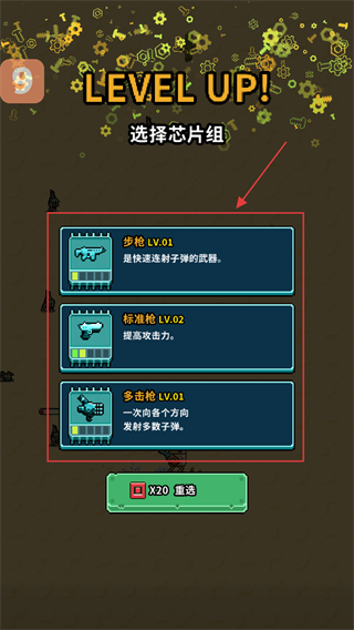 4、升级时选择芯片组,可从【步枪-LV.01】【标准枪-LV.02】【多击枪-LV.01】选其一强化自身武器。