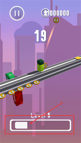 2、在【Level-5】进程中,持续收集沿途【金币】积累资源,关注下方进度条状态,保持角色稳定前进,提升至【19】的关卡进度。