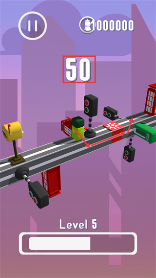 3、在【Level-5】后期阶段,规避【交通灯-障碍】等危险元素,稳步推进以达成当前【50】的关卡进度目标,减少失误风险。